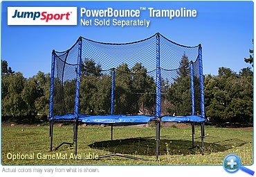 This state-of-the-art technology improves both shock-absorption and bounce performance. It's the first and only single-bed trampoline that can be tuned for different age, weight, and skill levels, yet it also broadens the performance spectrum so that jumpers with a wider range of weights and skill levels can safely enjoy the same setup. Free Trampoline Frame Pad The frame pad is blue in color, over 13.75 inches wide, and 1 inch thick at the frame tapering to half an inch. Expanded polyethylene (EPE), closed-cell foam padding is used across the entire pad surface, not just at the edge. The foam is covered by a High-tenacity Polyvinyl Chloride (PVC) outer shell that is UV- and water-resistant. Other manufacturers use a cheap tarp material to cover the foam, which falls apart very quickly. TripleStage-DualSpring Assembly The heart of the PowerBounce system is our patented TripleStage-DualSpring assembly. Each assembly consists of two High-Performance springs mounted on our PowerArm fitting. The upper, Primary Spring locks the PowerArm into the V-ring, while the lower, PowerSpring attaches to one of the PowerArm's three stages - the top, middle, or bottom setting. Don't Forget a Safety Enclosure! The PowerBounce and other JumpSport models are the first and only trampolines designed to reduce the risk of injury on the jumping surface, where more than half of all trampoline injuries occur. Our 12 foot and 14 foot trampoline systems custom fit with our safety enclosures: Model 480 is recommended for this trampoline. This model builds on the 380, which features patented Triple-back-up safety design with added strap and shock cord suspension system to improve safety, shock-absorption, and help push jumpers back onto the trampoline. Model 480 features high-strength netting that is 70% strong and is rated for 295 lb. jumpers. Add a Ladder! Access your trampoline with ease! Add a JumpSport trampoline ladder today. The 2-Step Ladder is compatible with this model.